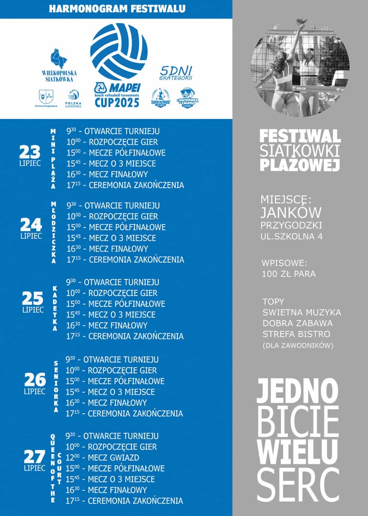 W ciągu 5 dni w Jankowie Przygodzkim zagra aż 7 kategorii, a niegrający mogą liczyć na wspaniałą zabawę, świetne jedzenie oraz mnóstwo atrakcji. Organizatorem turnieju jest GLKS Barycz Janków Przygodzki, a sponsorem tytularnym i głównym partnerem firma Mapei. To wyjątkowe wydarzenie, które łączy pasję do sportu, ducha rywalizacji i niezapomniane emocje. Mapei CUP to nie tylko turniej, to prawdziwe święto siatkówki plażowej, które łączy ludzi i tworzy piękne wspomnienia.